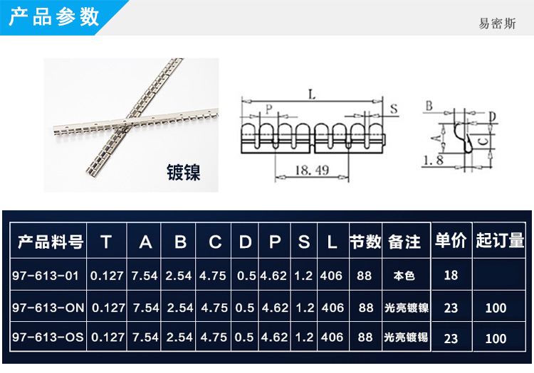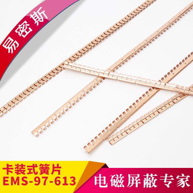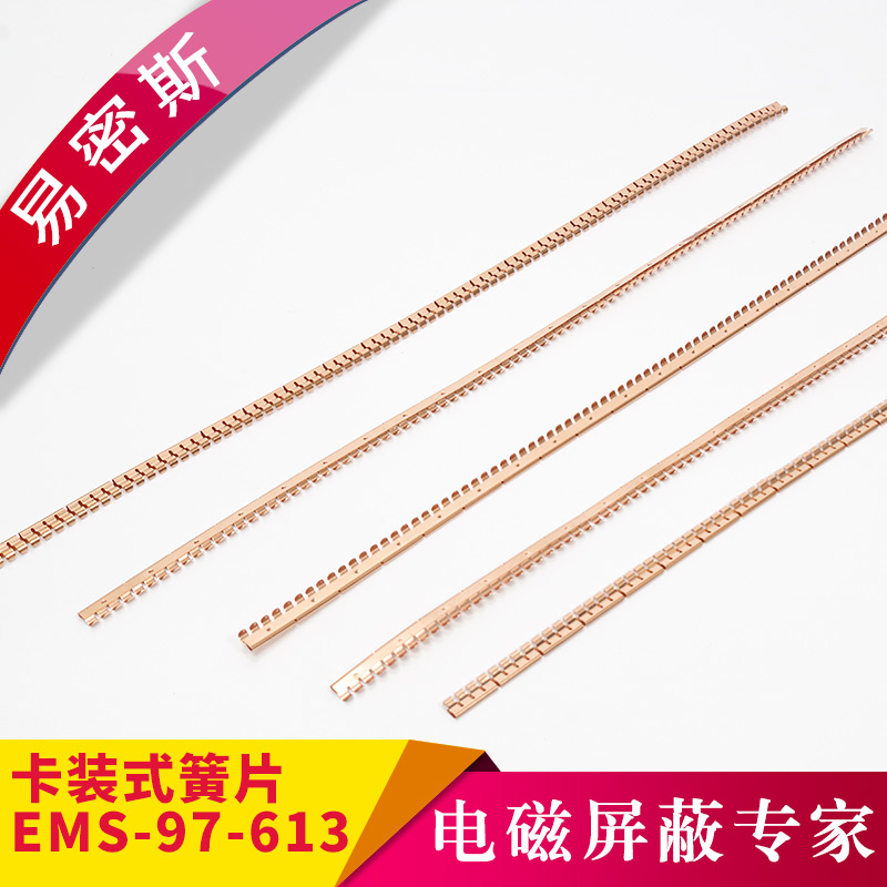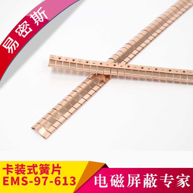 易密斯™鈹銅簧片由具有電磁兼容屏蔽效果的進口鈹銅合金C17200制成,具有優秀的抗壓性、回彈性和耐腐蝕性,并提供很好的寬頻電磁屏蔽效果,特別適用于通訊機柜、電腦、屏蔽室/門、面板及插拔件的間隙填充。易密斯™鈹銅簧片現有60余款標準件可供選擇,同時可支持定制。