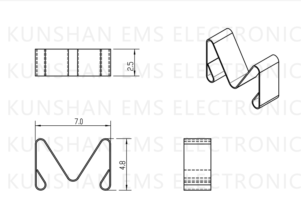 相信大部分工程師對金屬簧片并不陌生,它最主要的作用就是是垂直連接兩個導體面,在結構設計受限制的情況下,實現(xiàn)電路板與地平面的良好接觸。金屬簧片的材料以鈹銅最佳,鈹銅是一種高強度、高導電性的合金,能夠保證金屬簧片的高強度與高性能。在電子水泵中,控制板有時會因設計原因,電路板局部面積無法布線連接到地平面上,這就需要金屬簧片發(fā)揮作用,典型案例就是易密斯公司推出的這款M形狀的鍍金彈片