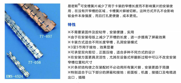 EMS-78-056鈹銅簧片多少錢,一款好的鈹銅簧片,不僅要具有價格優勢,同時要能滿足廠家生產工藝的實際需求,所以購買的朋友在考慮簧片多少錢的同時,更要注重所采購的屏蔽簧片質量的穩定性。易密斯屏蔽材料作為國內屏蔽行業的翹楚,有著10年以上工廠經驗和全套生產設備,產品通過ISO9001質量體系認證。已成功為國內眾多廠家提供了優良產品和貼心服務。